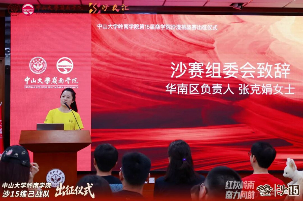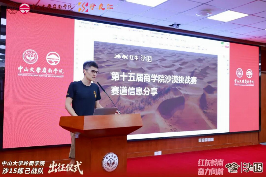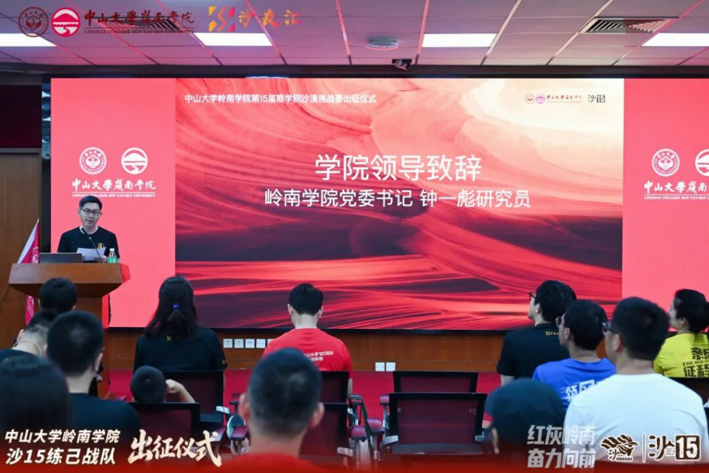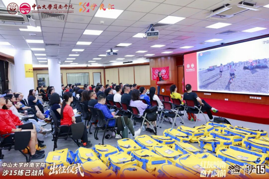 2026年4月19日,中山大学岭南学院沙15战队出征仪式在岭南堂三楼隆重举行,传承“无体育不岭南”的优良传统,续写岭院沙赛荣光。学院领导、专硕中心老师、专硕同学会代表、往届沙赛领队与沙友、沙15全体队员齐聚一堂,共赴这场关于勇气、坚持与传承的大漠之约,为即将征战腾格里的勇士们壮行助威。