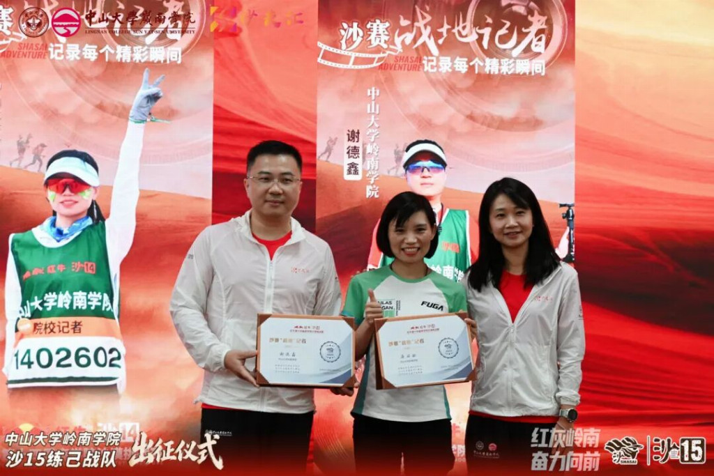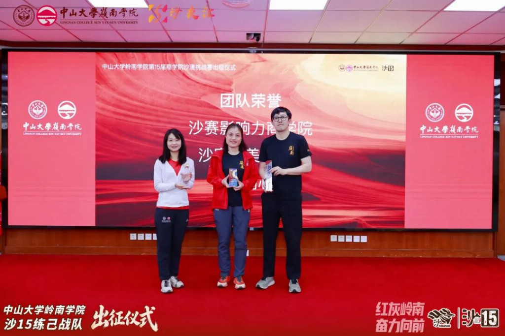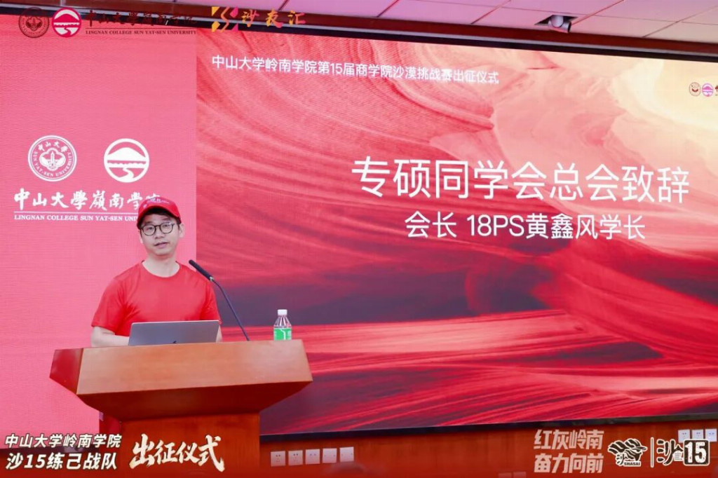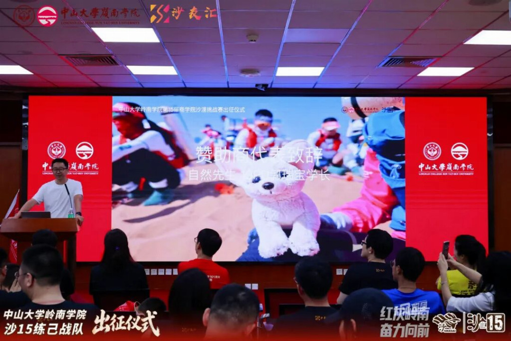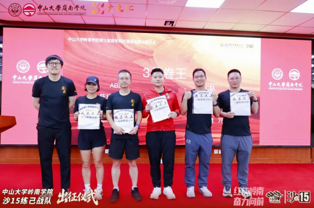 2026年4月19日,中山大学岭南学院沙15战队出征仪式在岭南堂三楼隆重举行,传承“无体育不岭南”的优良传统,续写岭院沙赛荣光。学院领导、专硕中心老师、专硕同学会代表、往届沙赛领队与沙友、沙15全体队员齐聚一堂,共赴这场关于勇气、坚持与传承的大漠之约,为即将征战腾格里的勇士们壮行助威。