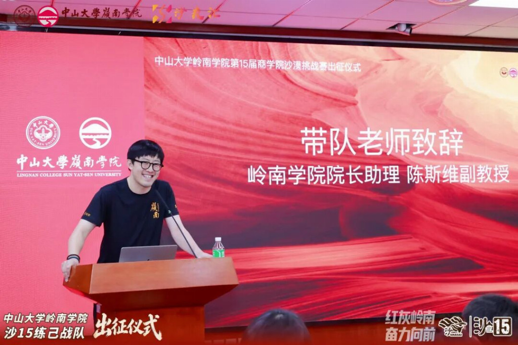 陈斯维副教授结合岭院专硕教育特色与沙赛精神传承,寄语队员们以沙为媒、以赛砺心,在腾格里沙漠的挑战中锤炼意志、凝聚力量。