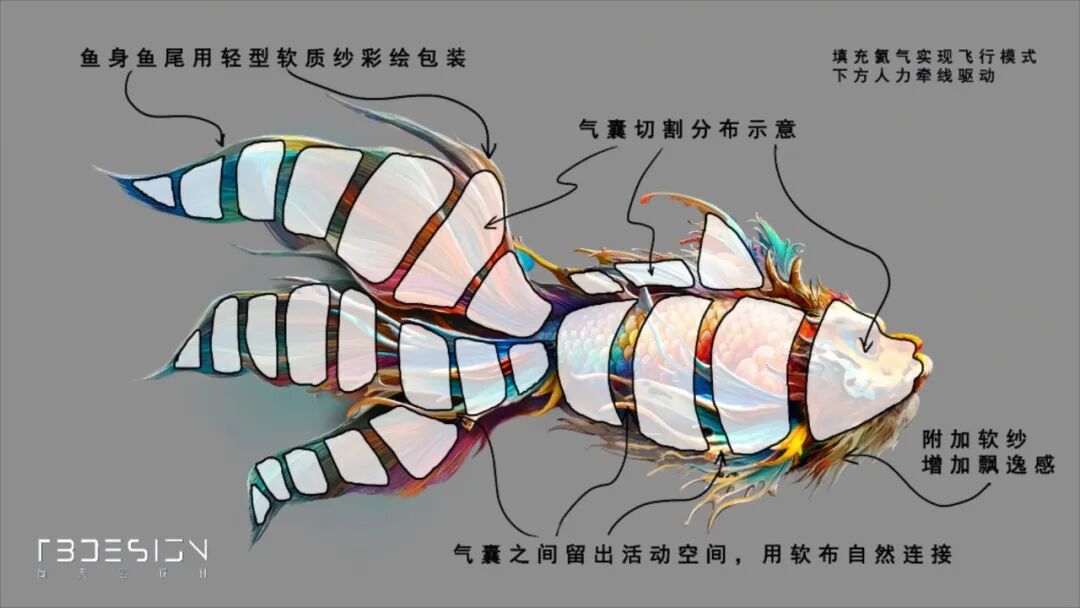 根据开幕式美术总设计尚天宝提供的资料显示,这些气囊分布在鱼头、鱼身、鱼鳍和鱼尾处,气囊之间留出活动空间,仿生分段结构使它更能灵活“游动”。