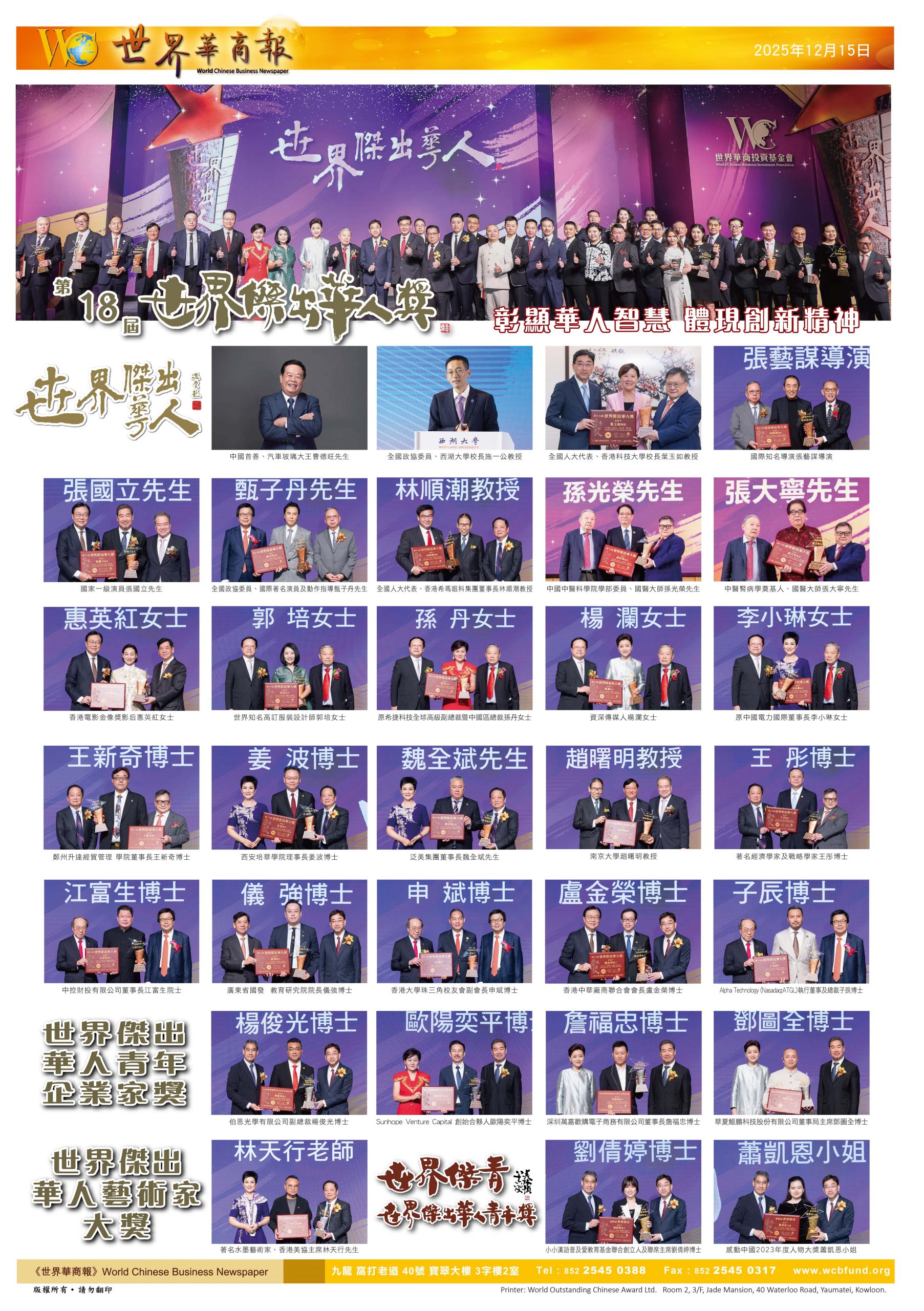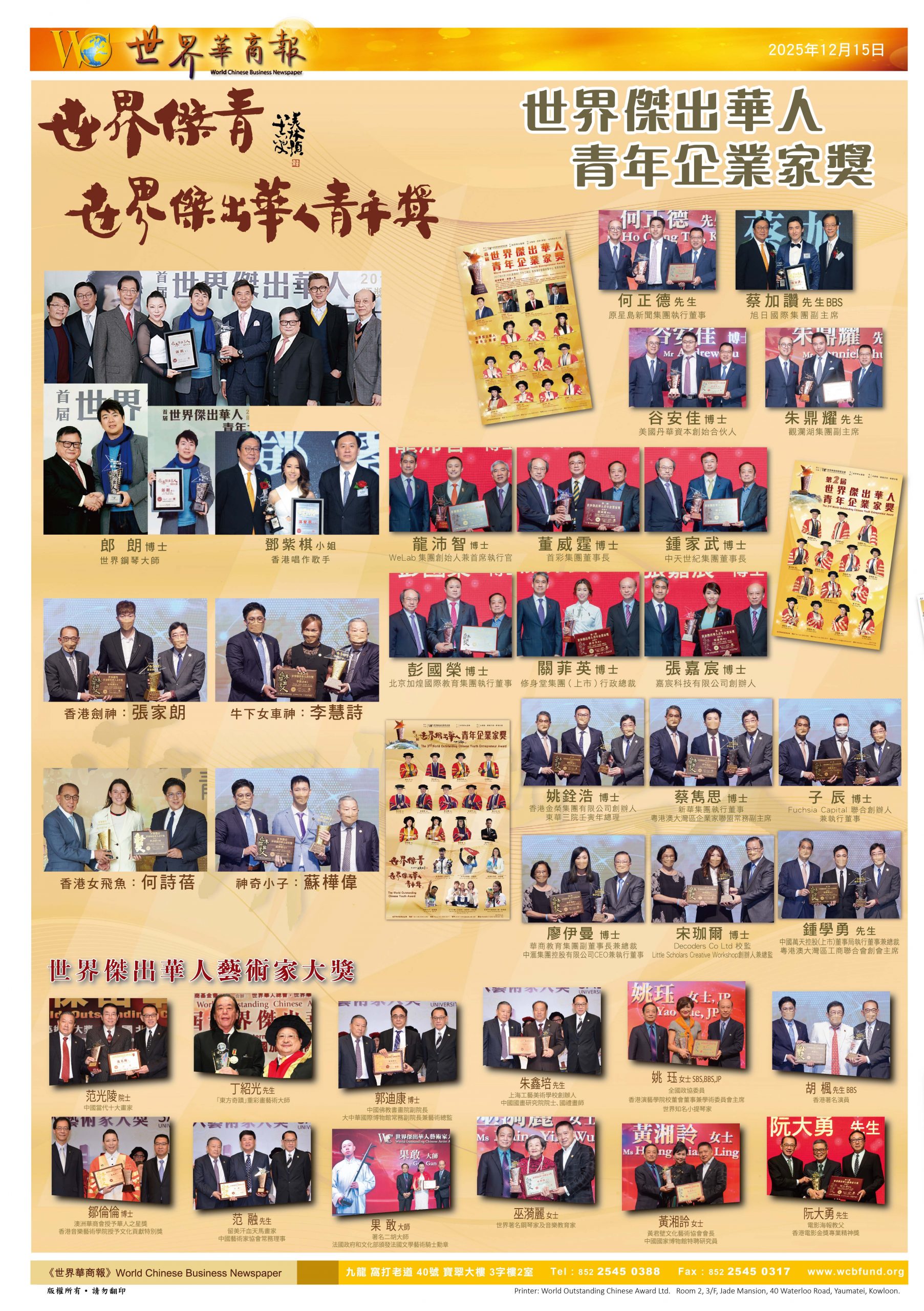 世界杰出华人青年企业家:蔡加赞先生、龙沛智博士、朱鼎耀先生、何正德先生、钟家武博士、姚铨浩博士、钟学勇先生、廖伊曼博士、宋珈尔博士、蔡隽思博士、杨俊光博士、欧阳奕平博士、詹福忠博士、邓图全博士等,在金融科技、创新服务、文化创意等领域崭露头角,以前瞻视野与数字化思维开拓商业新局,展现华人青年企业家的活力与担当。