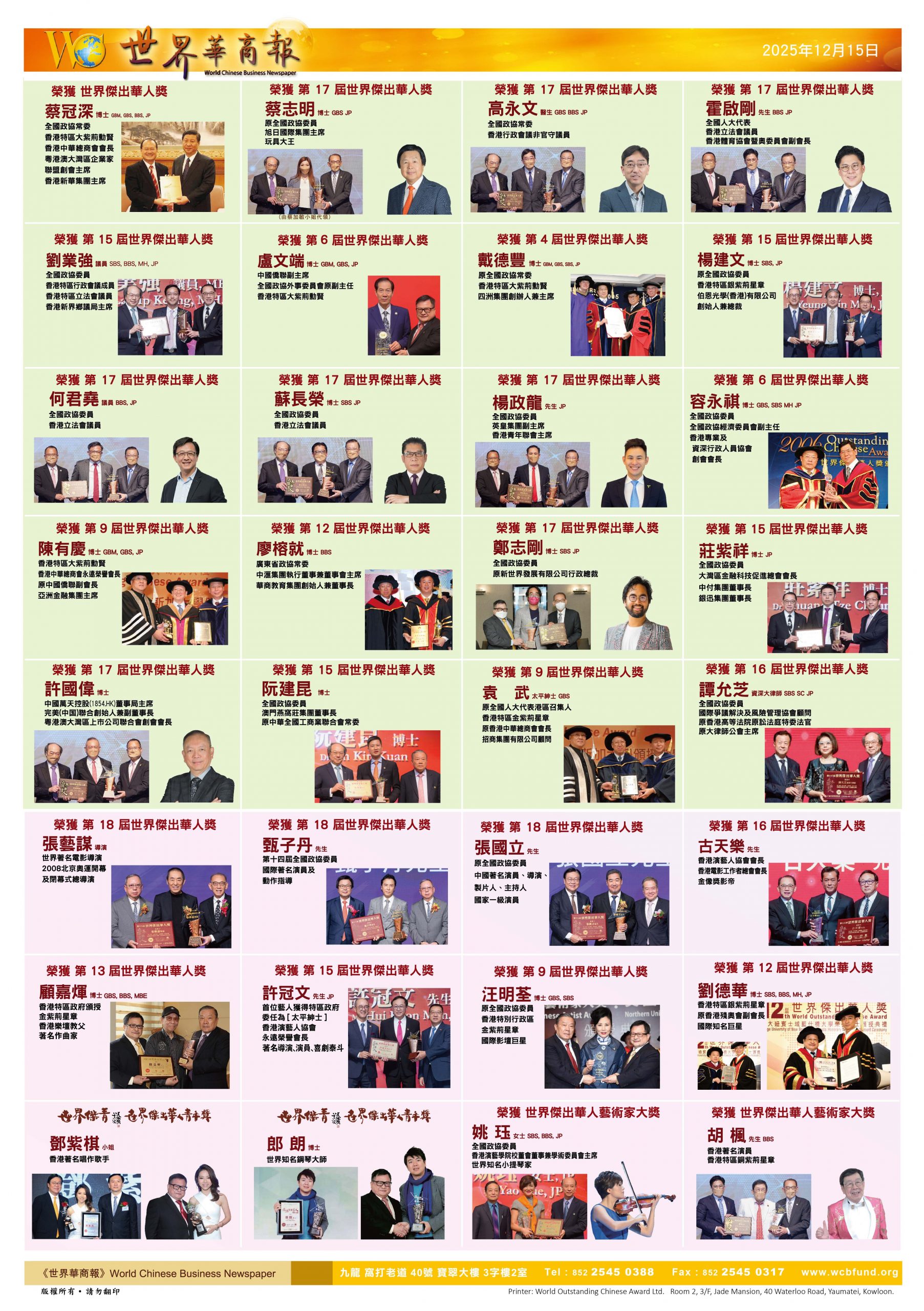 历届世界杰出华人商界翘楚:全国政协常委、香港中华总商会会长蔡冠深博士;中国侨联副主席卢文端博士;伯恩光学有限公司创始人杨建文博士;香港大紫荆勋贤戴德丰博士;全国政协委员、香港立法会议员刘业强议员;全国政协庄紫祥博士;全国政协委员阮建昆博士;全国政协委员郑志刚博士;全国政协委员杨政龙先生;原全国人大袁武太平绅士;钨钢大王廖万隆先生;中国侨联常务副会长古润金博士;粤港澳大湾区上市公司联合会创会会长许国伟博士等等,在各自领域书写着辉煌,他们以商业成功反馈社会,推动经济与公益协同发展。