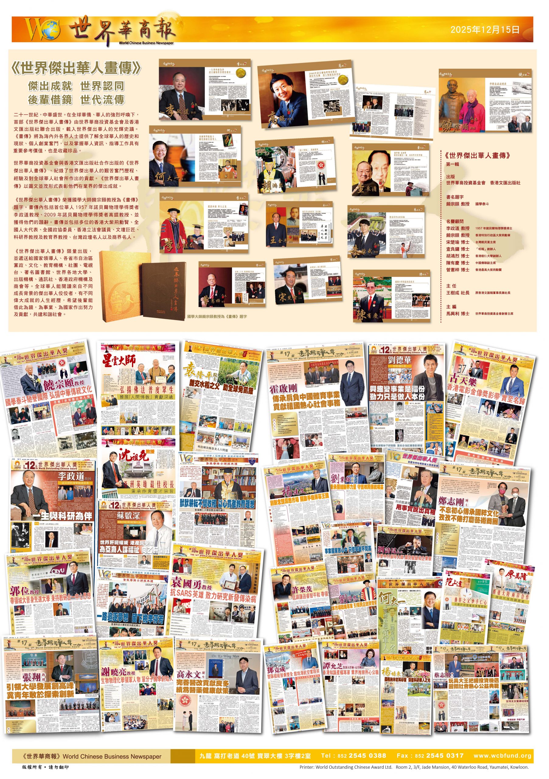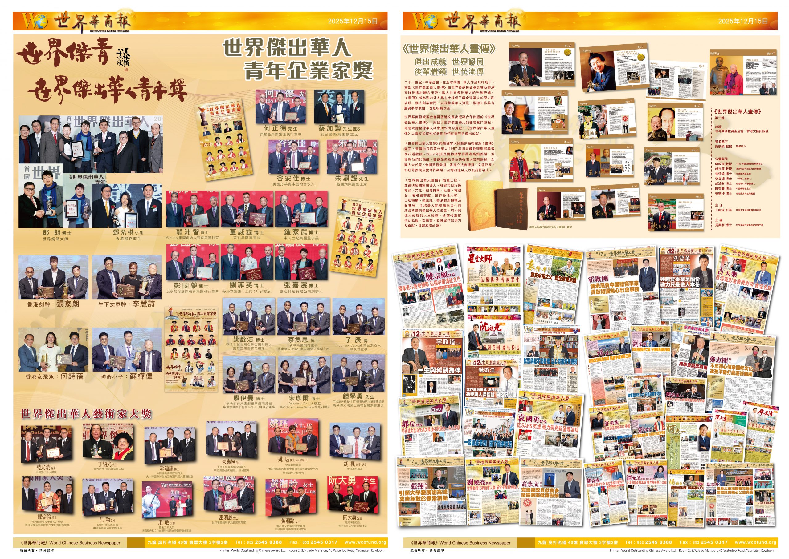 “世界杰出华人奖”通过严谨的社会推荐与联合评选机制,举办十八届以来持续表彰在科研、航天、法律、医学、教育、政商、体育、文化、演艺、公益等各领域为世界进步与中华复兴作出卓越贡献的杰出人物。